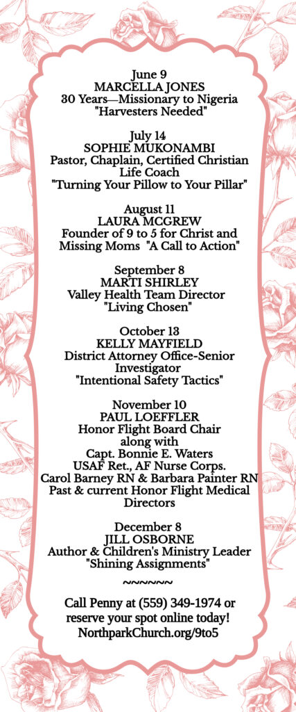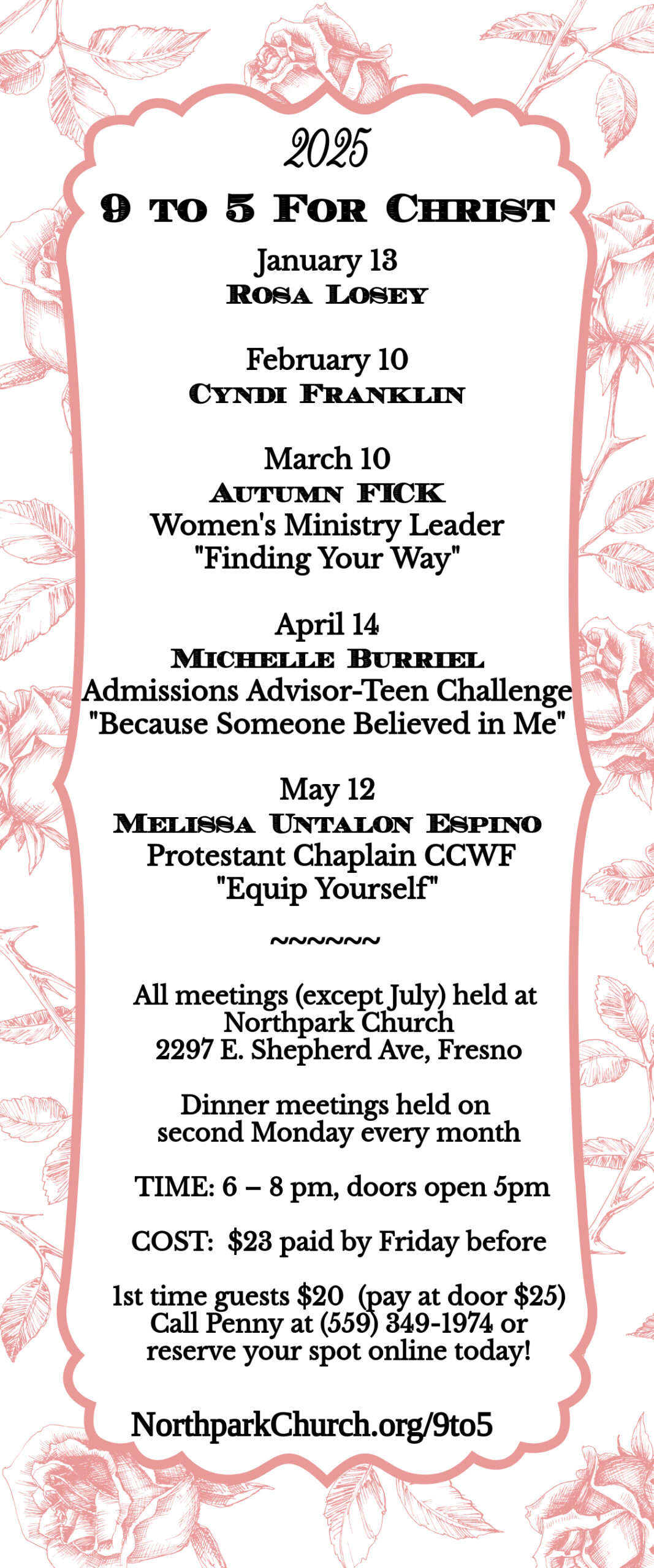 We ask our vendors to bring 3 gifts valued at $10 or more each for our raffle drawings and pay in advance for your dinner. You will have 2-3 minutes to tell us about your business or ministry and we will have a 6′ table available for you to put your items on that you are selling. Reservations for being a vendor must be made at least a week in advance and spots are limited. Please contact Penny at 559-349-1974 or pretypeny1@aol.com