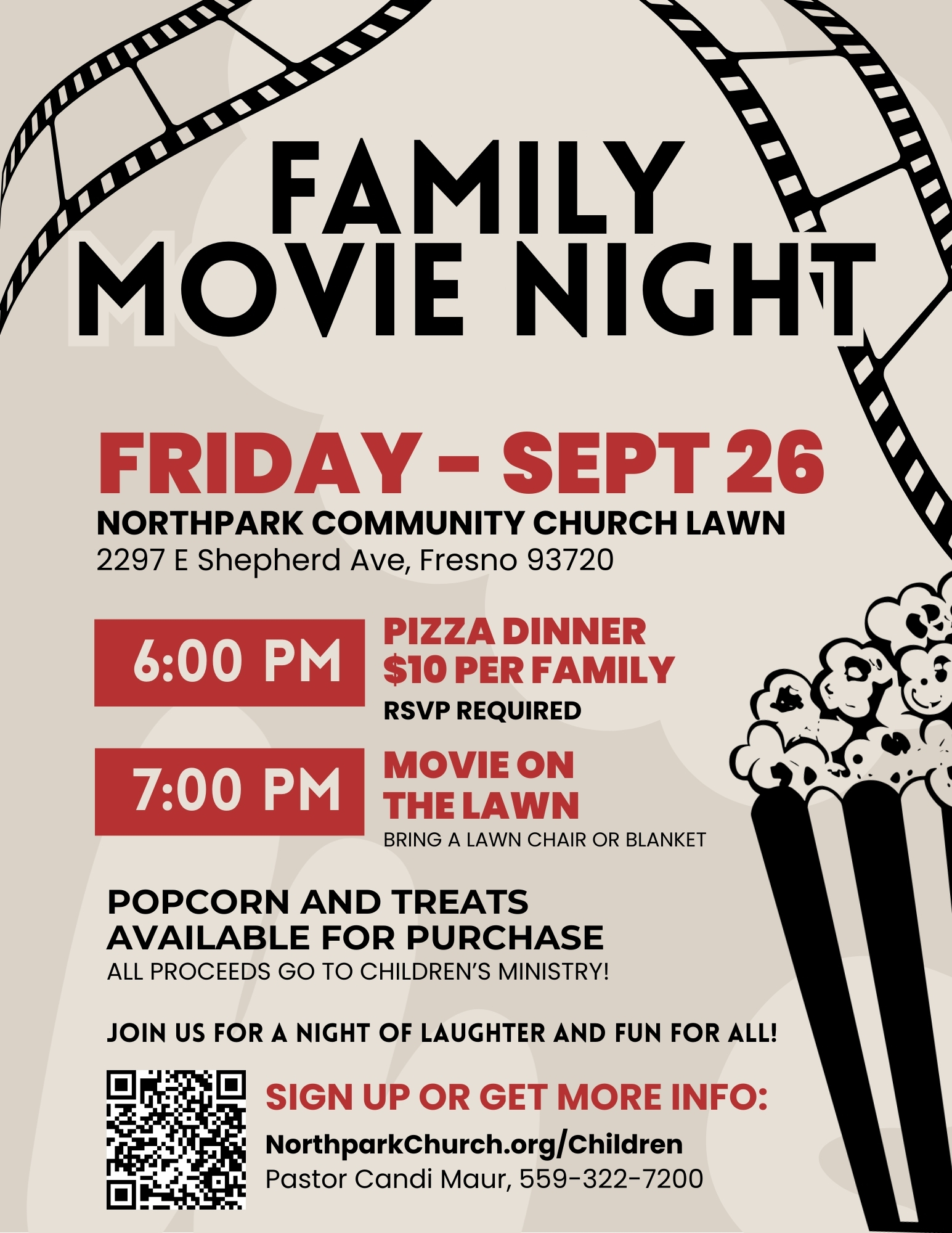 Popcorn and treats available for purchase. All proceeds go to Children’s Ministry.